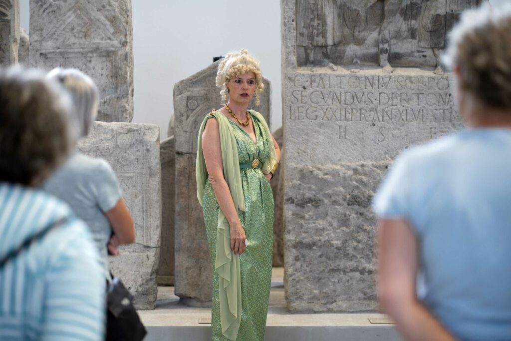 Eine vergnügliche Stunde lang plaudert Aurelia, Frau des römischen Statthalters der Provinz Obergermanien, über all das, was ihr beim Betrachten der Ausstellungsstücke in der Steinhalle des Landesmuseums gerade so einfällt: Seeungeheuer, Haussklaven, gedämpfte Flamingos oder Furunkel. Und vermittelt scheinbar beiläufig eine Menge Geschichten und Geschichte aus der bedeutenden römischen Garnisons- und Provinzhauptstadt Mogontiacum.